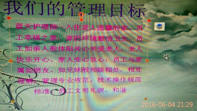 蓝天护理院~~入住老人温馨的家、员工幸福之家;家的环境整洁卫生,员工如亲人般体贴关心关爱呵护老人,老人快乐开心,家人安心放心;员工与家属如朋友、如兄妹般和睦相处,互相理解、互相体谅;管理专业规范,员工技能精湛,文明礼貌,爱岗敬业。