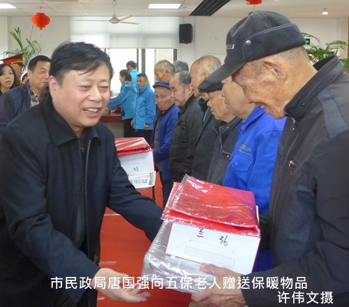 空港经济开发区社会事业局张群局长向五保老人赠送御寒物品