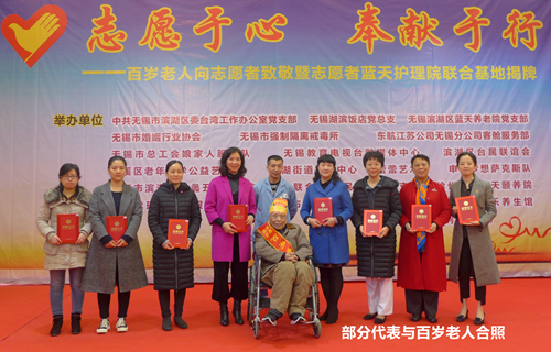 “向你们志愿者致敬,祝你们志愿者节日快乐!”12月3日上午,百岁老人顾蓉初先生在无锡蓝天护理院住养楼蓝天大厅,向无锡市总工会娘家人服务队、中共无锡市滨湖区委台湾工作办公室党支部、无锡湖滨饭店党总支、东航江苏公司无锡分公司客舱服务部、无锡市婚姻行业协会、蠡湖街道文体中心等爱心单位和社会组织的志愿者代表,一一颁发了由该院签发的2018年优秀志愿者证书。当天,来自全市各地的18个单位和社会组织的近百名志愿者代表,齐聚在位于无锡市滨湖区天竺花园58号的无锡蓝天护理院住养楼蓝天大厅举办“志愿于心,奉献于行”公益活动,庆祝第33个国际志愿日,并成立了首个志愿者在护理院的联合服务基地。