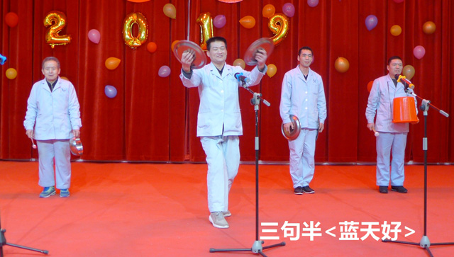 “蓝天发展靠大家、我们都是主人翁,遇着困难一起上,成功!”由苏元亮、赵顺龙、于军、陈银涛等担当传统三句半<蓝天好>,蓝天护理院护理部主任与楼层护士长王天天、田孝勤、王雪、王爱娜等在传统三句半最后,打礼花,撒红包,引爆全场哄动。”护士王天天在当晚现场接受采访时说,这个节目,是众人合力自创的,体现的就是台词中一句:蓝天是咱家,幸福连着你我他。