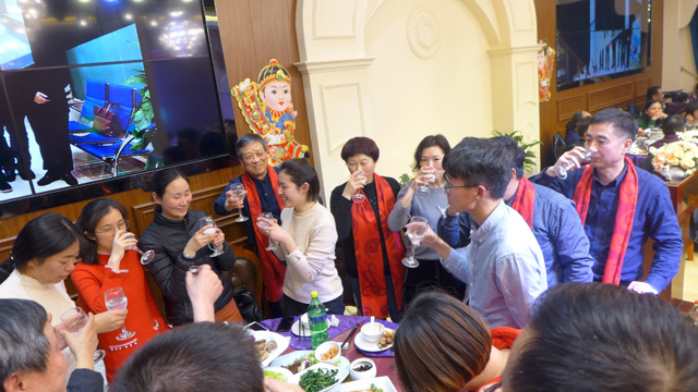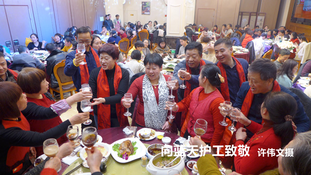 2019年“蓝天下的微笑”迎新春文艺晚会各奖项,昨晚在无锡蓝天护理院总院职工年夜饭上揭晓,同时抽出预示来年六六大顺吉利数的66个红包当晚现场兑奖。蓝天护理院总院职工在频频干杯声、笑声、掌声、歌声中尽情享受着丰盛的,专属于自己的一顿开心年夜饭。