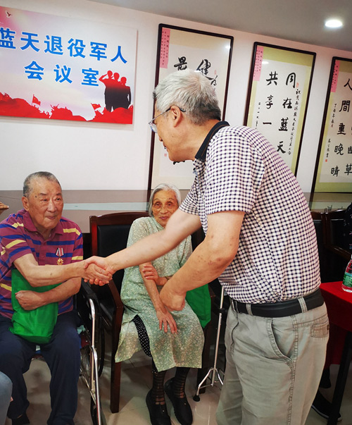 在蓝天养老院的沈锡坤胸前挂着在部队荣立三等功的八一勋章,在震泽军休所徐洪才所长(图左)见证下,86岁的退役军人、原武警无锡消防支队副支队长沈锡坤(图1前中)在现场向蓝天护理院赠送了“不忘初心关心病员,亲民廉洁医德高尚”的锦旗。曾在二军大高护本科毕业的蓝天护理院护理部主任高雪表示,将用24小时专护为退伍军人提供高质量服务。
