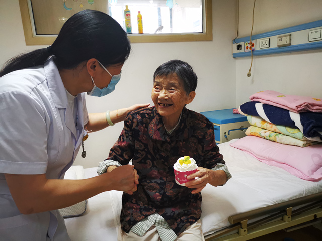 疫情无情,蓝天有爱。由于新冠肺炎的影响,蓝天养老院今年取消了每月固定的集体生日会,但蓝天的员工们早就把入住老年人当成了自己的亲人,9月15日,蓝天养老院办公室主任杜咪咪、工会主席赵菊与楼层医生、护士来到了各个老人的房间,为9月生日的26位老人送上精心准备的生日蛋糕,并带去了生日的祝福。