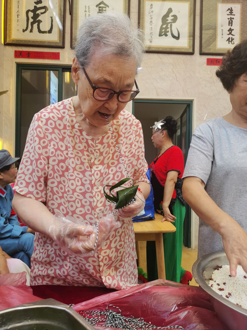 舞台下,义工们给与长者们理发、剪指甲也忙得不亦乐乎,另一边包粽子活动也正式开始啦!开原义工们准备好粽叶、糯米、蜜枣、鲜肉、棉线等食材和工具,一片片清香的粽叶、一粒粒晶莹的糯米,在一双双巧手下转眼变成了一个个诱人的粽子。一只只粽子不仅裹起红枣的香甜、猪肉的浓香,也让老人们心中暖暖的,感受了家的温暖。老人们参与其中,体验着共同劳动的乐趣,大家共包了百余个粽子,小小的粽子,承载着老人们对幸福生活的期盼。
