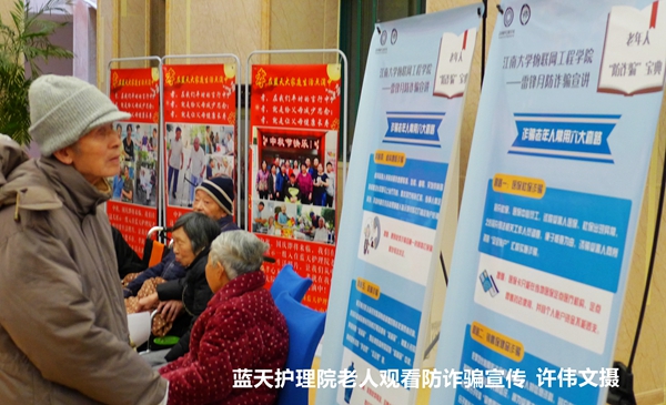 江南大学物联网工程学院的大三学生王思聪和其他“学雷锋”电子服务志愿团的张鑫磊、唐志强、管梓程、王泽、蔡煜瑶、王宇兴、温馨雨、吴宸栋等同学,带着他们的雷锋月活动宣传X架和防诈骗系列彩页,在蓝天大厅与在那里休息、娱乐的入住老人开展了互动。